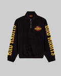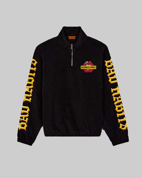 Dial up your streetwear game with the Calling All Angels Zip Sweatshirt. Crafted in jet black with bold yellow "Bad Habits" lettering down each sleeve, this pullover makes a statement without saying a word. The half-zip design adds an edge of versatility, while the signature lips patch on the chest keeps it playful and iconic.