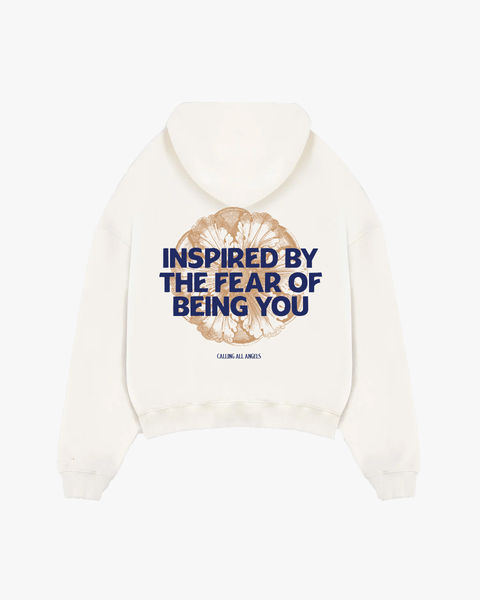 Confidence meets comfort in this cream-toned “Inspired By The Fear of Being You” Hoodie. A style that speaks without trying too hard.