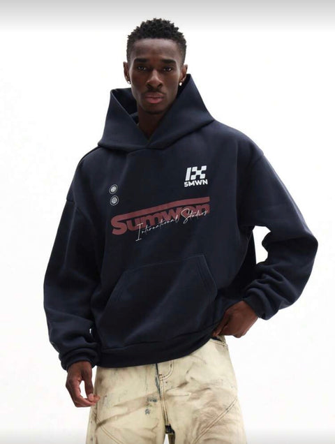 Description: A modern boxy-fit hoodie with bold International Studios branding for effortless street style.