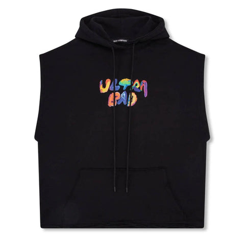 Make a bold statement with the ULTRA BAD Sleeveless Hoodie, designed for ultimate comfort and standout style. This black hoodie features a striking Ultra Bad typography print, paired with hand-cut edges that add a unique, modern touch.