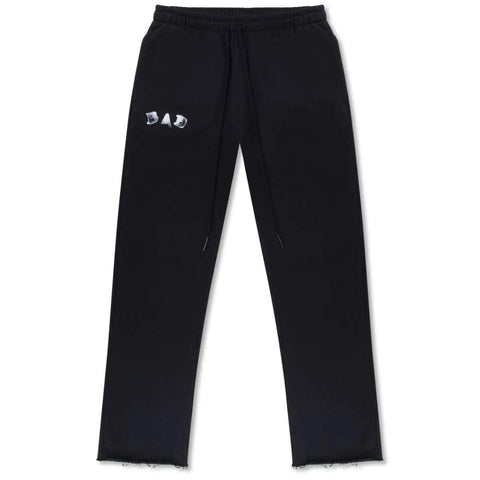 Enjoy style and comfort with BAD Pants, featuring a sleek black design and the BAD logo on the right thigh. These basic open-cut sweatpants are perfect for lounging or casual outings.